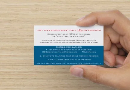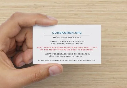 This is the back of the “Awareness” card. Most runners had no idea how little of their fundraising efforts goes to research—many were shocked, disappointed, and felt like they had been misled by Komen’s marketing and branding.